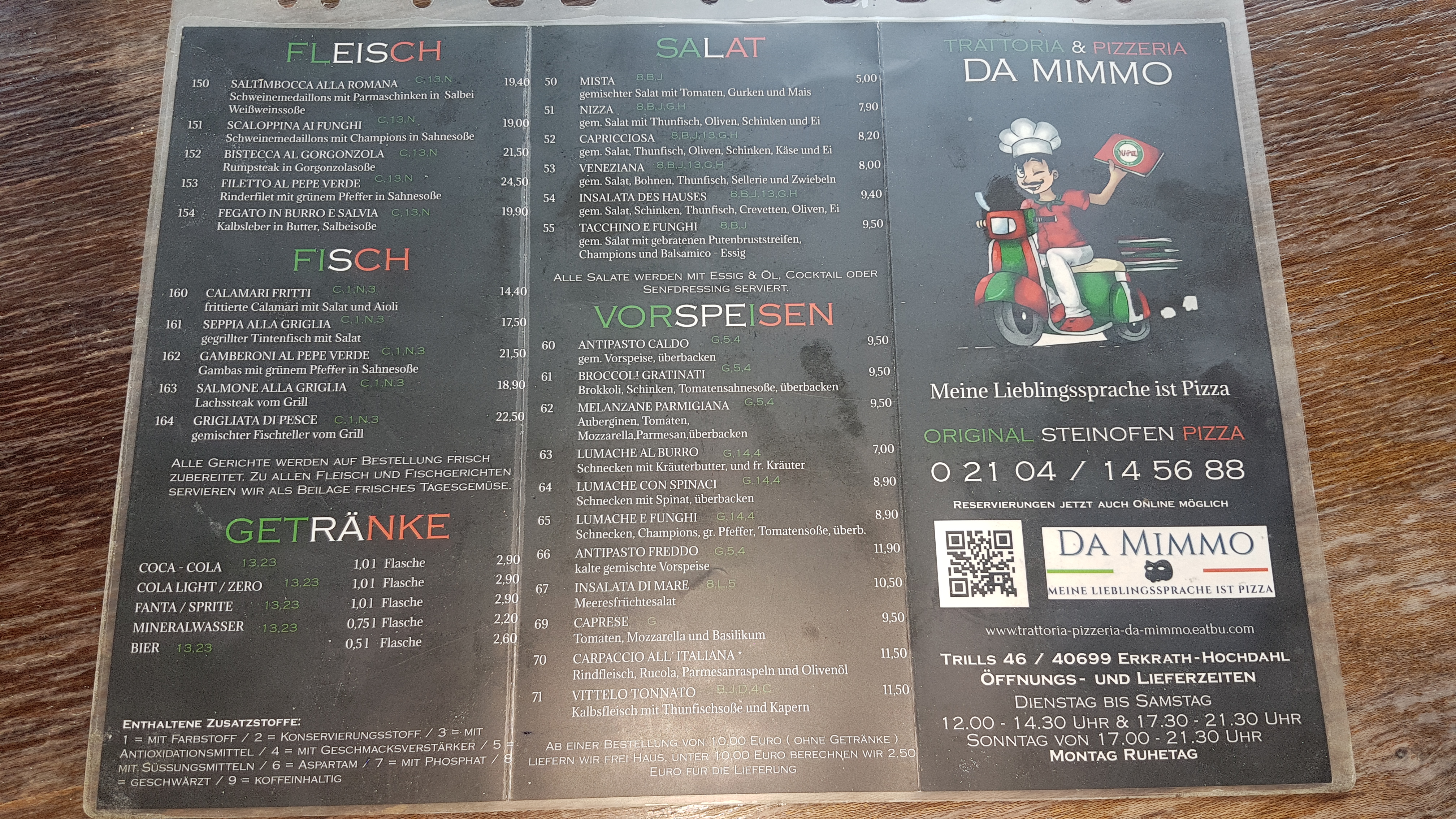 Willkommen in Trattoria Pizzeria da Mimmo in der wunderschönen Stadt Erkrath. Wir freuen uns, Sie als unseren Gast begrüßen zu dürfen! Sie werden mit echter Gastfreundschaft und einer herrlichen Auswahl an italienischer Küche begrüßt. Unser freundliches Personal serviert Ihnen hier die beste hausgemachte Küche und traditionelle Küche. Unsere köstlichen Speisen warten darauf, von Ihnen probiert zu werden. Wenn Sie eine Naschkatze sind, werden Sie unser köstliches Tiramisu genießen. Wir gehen auf unterschiedliche Ernährungsvorlieben ein und bieten eine Reihe laktosefreier, veganer und vegetarischer Optionen an. Erfrischendes Bier, Wein, Kaffee und Tee ergänzen Ihre Mahlzeit. Lehnen Sie sich zurück, entspannen Sie sich und genießen Sie Mittag- und Abendessen in unserem exquisiten Lokal. Zusätzlich zu unserem tollen Service gibt es schöne Musik.